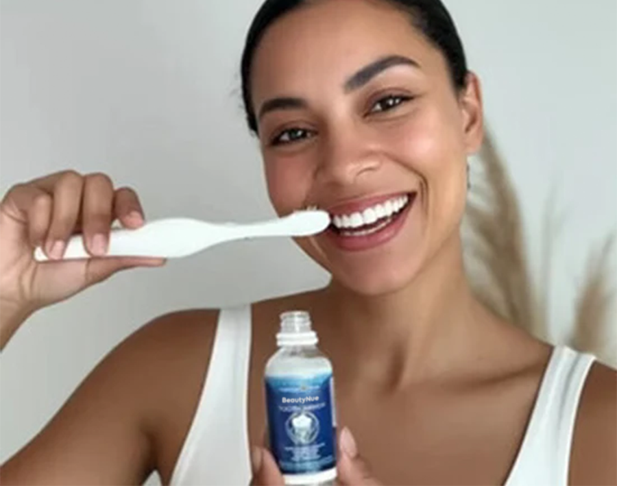 It’s very simple, just brush BeautyNue in with your regular fluoride-free toothpaste every morning and night. Do a 5-15 minute daily rinse for even better results.