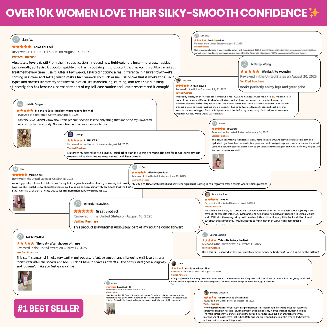 Our oil gently slows regrowth while deeply nourishing your skin—leaving you smoother, softer, and irritation-free.