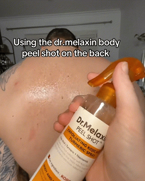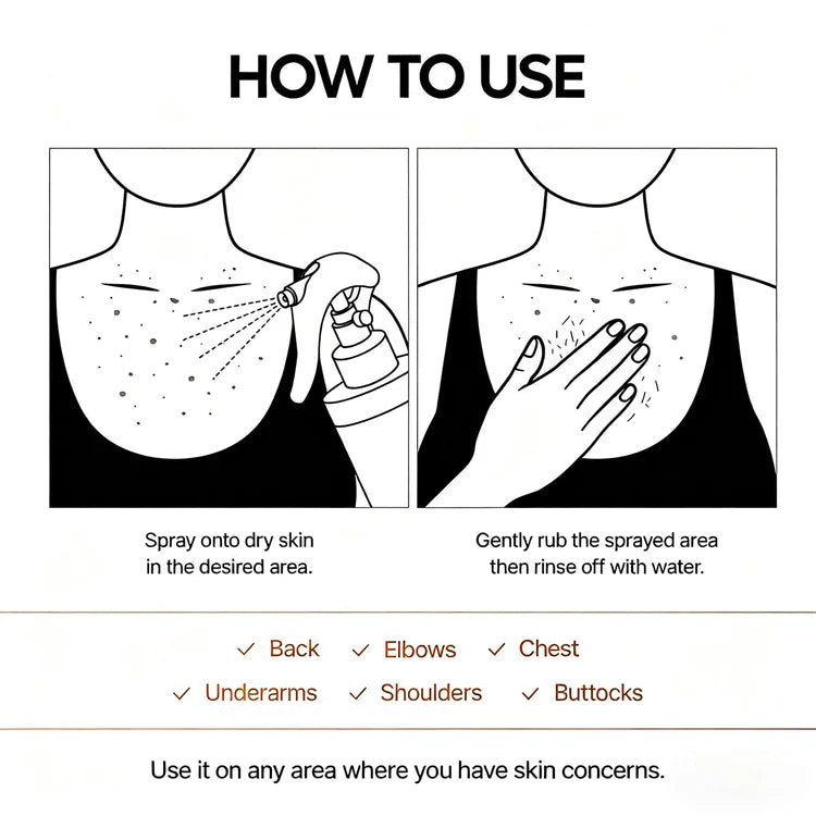 Step 1:Spray the product onto dry skin in the area where you want to address skin concerns, such as the back, elbows, chest, underarms, shoulders, or buttocks.