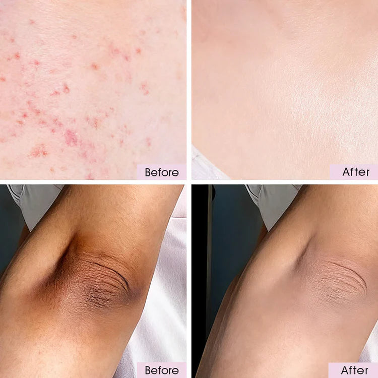 Before: The upper chest skin has noticeable red blemishes, with an uneven texture. The lower elbow appears dark, rough, and has prominent creases, looking rather dull.