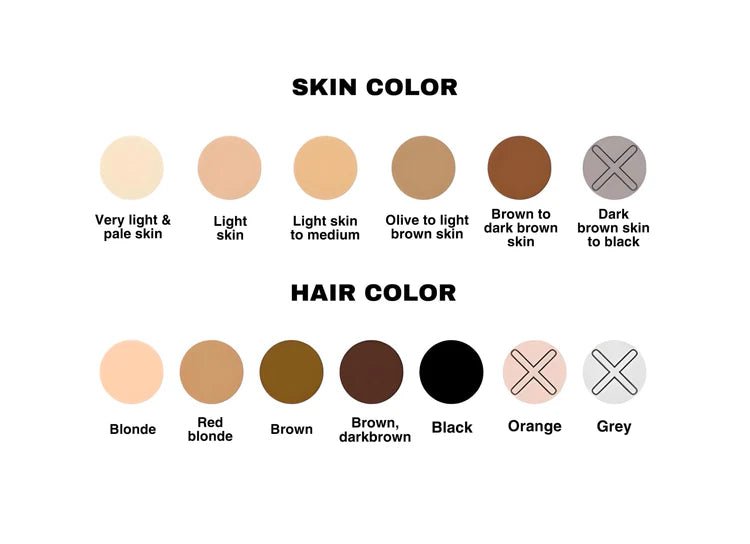 Our device works for skin types on the Fitzpatrick scale from I to V. People with darker skin (type VI) should not use the laser, as the light energy may not reach the hair root, which could result in injuries. The IPL is particularly suitable for dark blonde to black hair types. People with red or grey hair are excluded from the treatment, as the light cannot be sufficiently absorbed by these hair colors. Please check our color scale above.