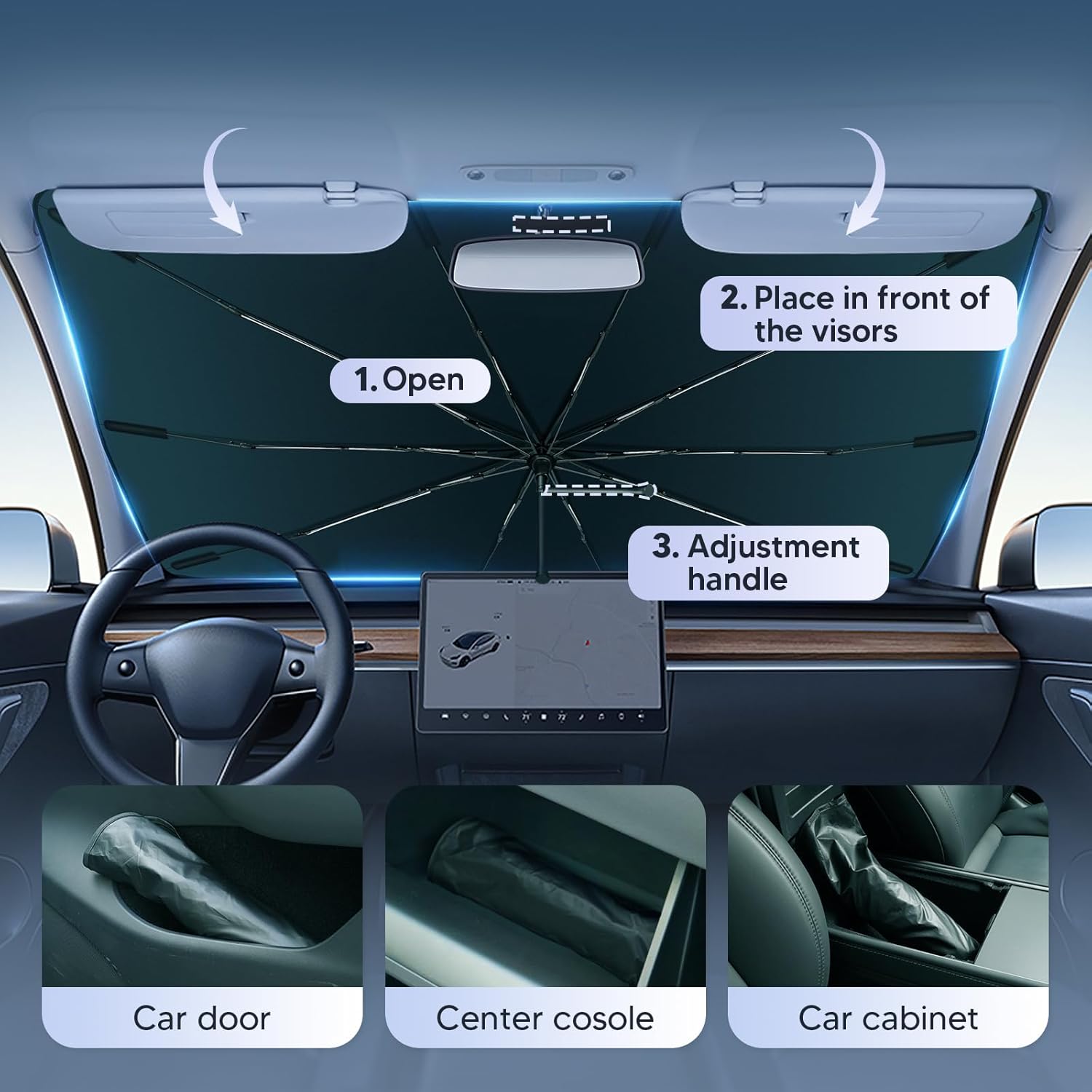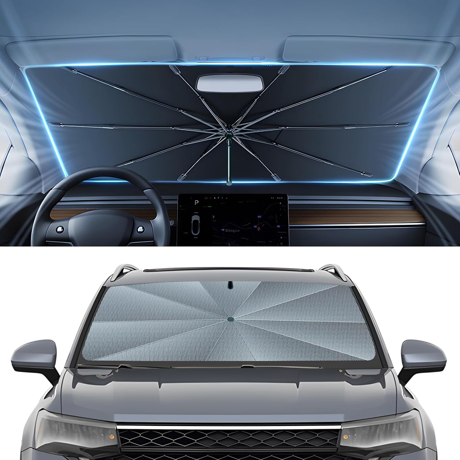 Effective Sun Protection - The Dimension is 55 * 31inch. Windshield sun shades are suitable for most vehicles, such as SUVs, MPVs, hatchbacks, mini trucks, vans, etc. The windshield umbrella reflects and blocks an intense heat and harmful UV rays, effectively keeping the interior of your car cool and preventing damage and aging car interiors.