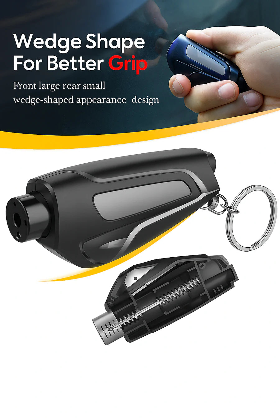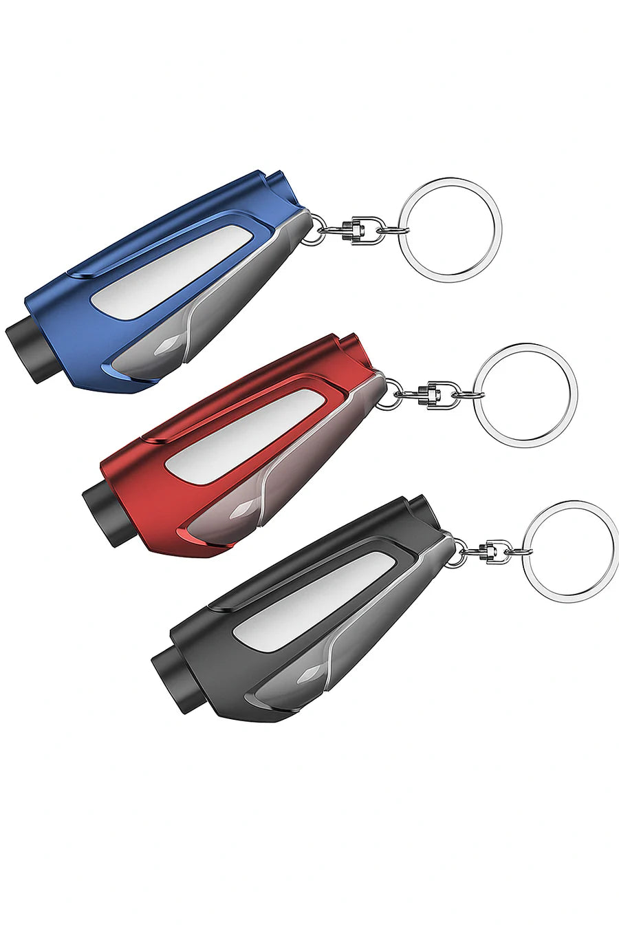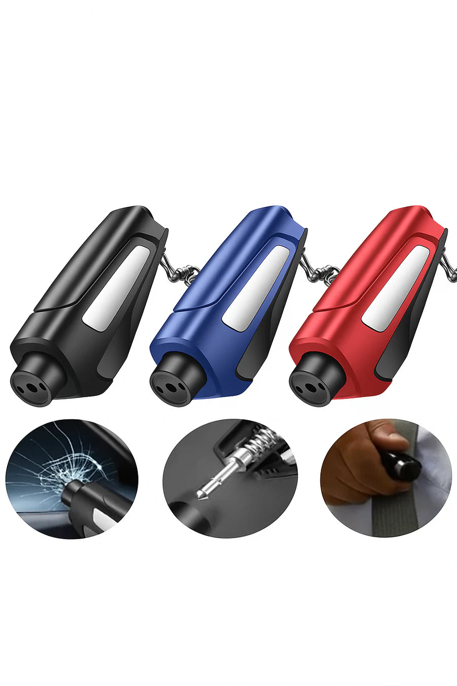 Pull it from the keychain, line up the seatbelt cutter, and slice through in one clean motion. Need to escape through a window? Place the tip against the corner of the glass and press. A loud snap signals your way out.
