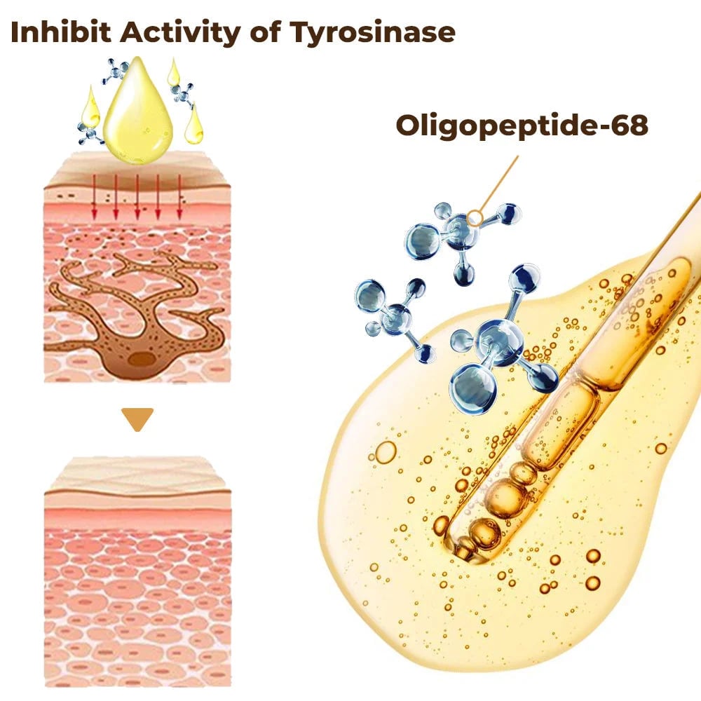 - Oligopeptide-68: This synthetic peptide inhibits tyrosinase, the enzyme responsible for melanin production. It works to lighten dark spots, age spots, and reduce overall pigmentation—giving your skin a smoother, more even tone.