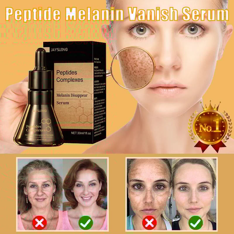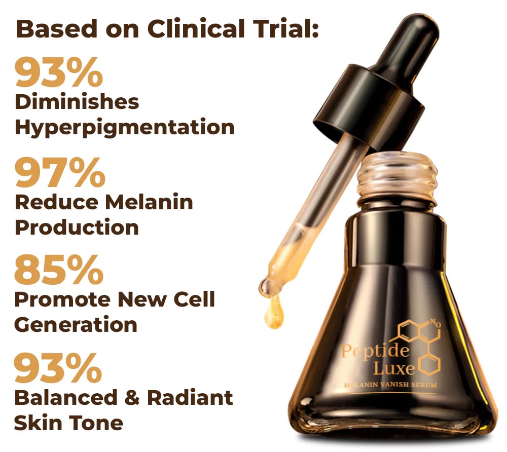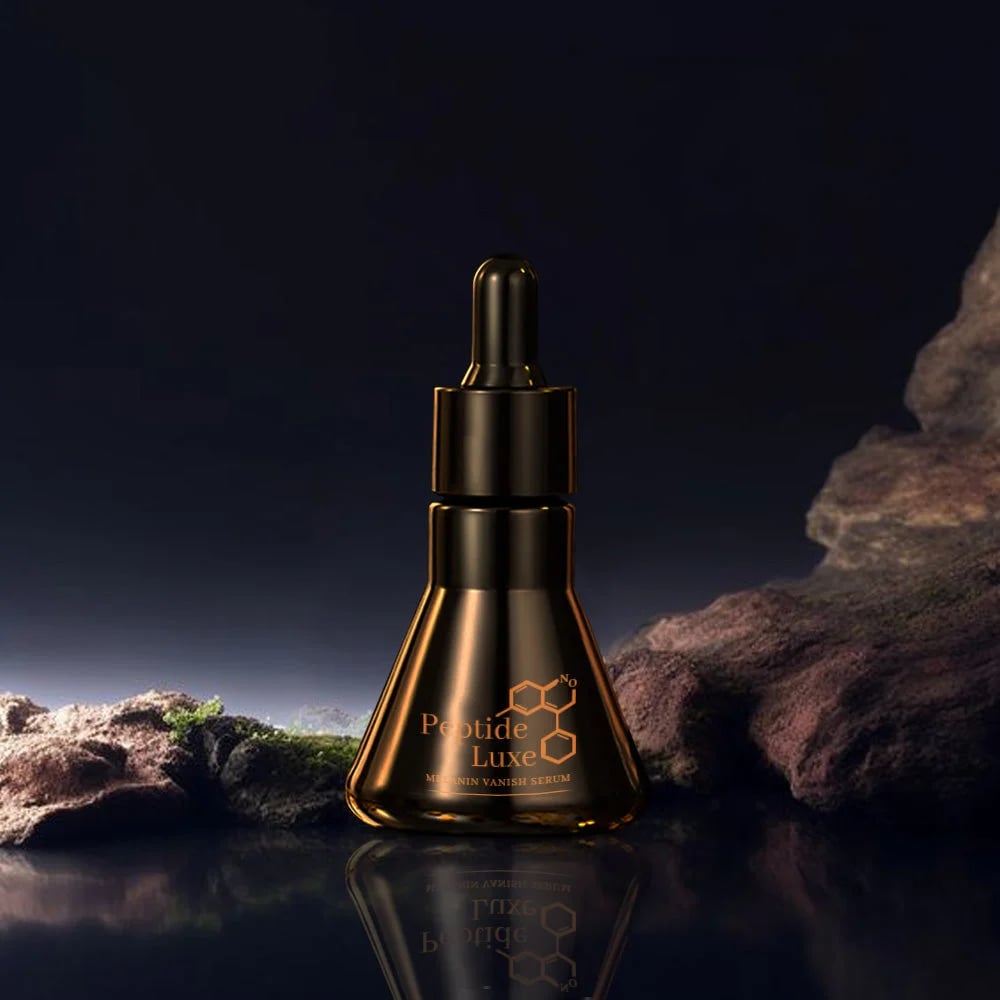 - PeptideLuxe Melanin Vanish Serum is packed with Oligopeptide-68 and Nonapeptide-1, which work together to inhibit melanin production, reduce discoloration, and promote an even skin tone. No more sun spots, melasma, or stubborn freckles—just bright, beautiful skin!