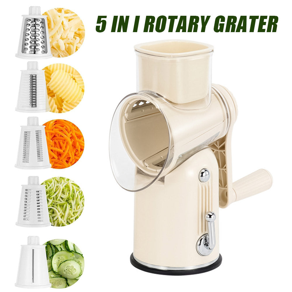 This new food grater and shredder speeds up chopping by 12 times, cutting prep time significantly. It includes 5 replaceable blades for slicing, shredding, and more—perfect for cheese, potatoes, zucchini, carrots, cucumber, and chocolate. Easy to use with just a few turns of the handle, it handles various cuts swiftly.