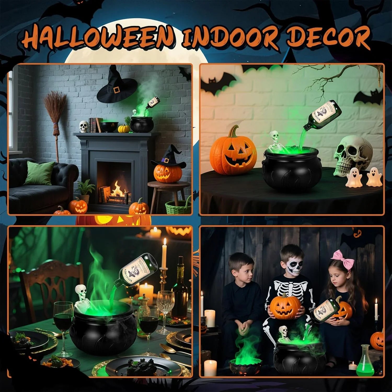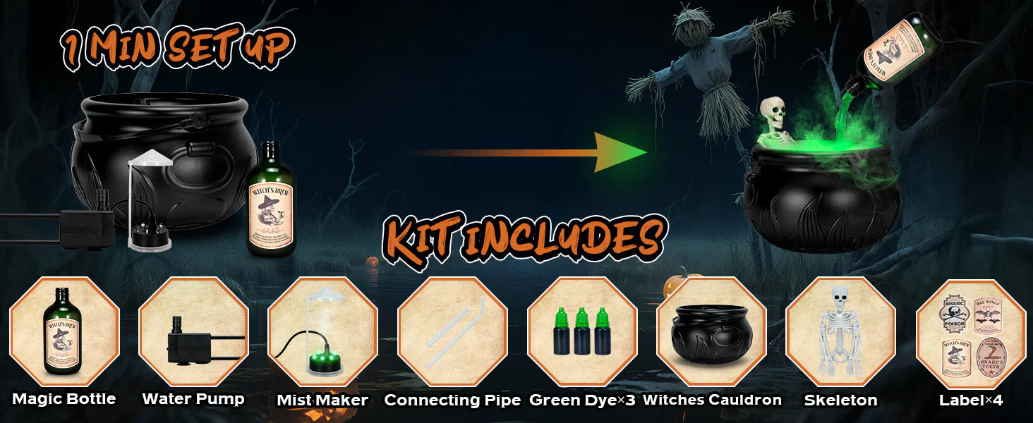 The kit includes a stylish black cauldron, a poseable skeleton, a fog maker, and an assortment of magical floating potion bottles. Everything you need for a stunning Halloween display is conveniently bundled together, ensuring a cohesive and captivating scene in your home.