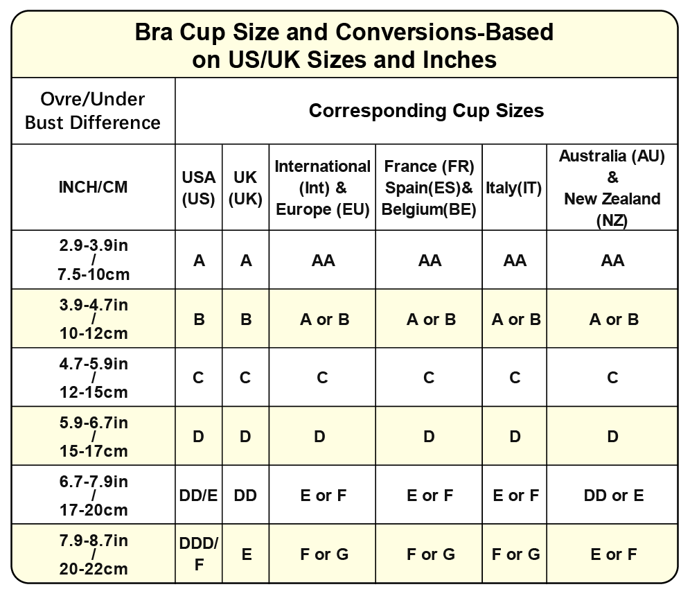 Answer: Step 1,Measure your band size Place the measuring tape around your ribcage, right underneath the band of your bra.Make sure it is pulled tight but is not uncomfortable and that the tape is level.Make a note of how many inches you are.If you land on an even number this is your band size.If you land on an odd number, you’ll want to round up or round down to the nearest even number based on your build. Step 2,Measure your bust size Place the measuring tape around the fullest part of your bust(at nipple level),making sure to hold the measuring tape snugly against you and parallel to the ground. You won’t need to pull the tape particularly tight for this measurement it just needs to sit flat.Make a note of how many inches you are.If it falls on the half-inch, just round up. That’s your bust size! Step 3,Determine Your Cup Size Minus your band size from your cup size and make a note of this value.This difference indicates your cup.Example: 37 inches (bust) – 34 inches (band) = 3 inches. That's a 34C. 0=AA , 1=A, 2=B, 3=C, 4=D, 5=DD(E),6=DDD(F), 7=G