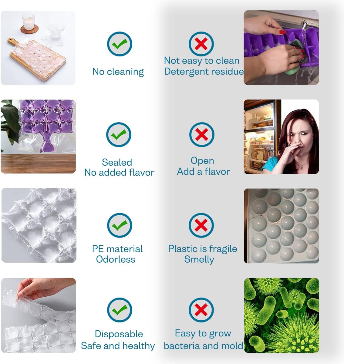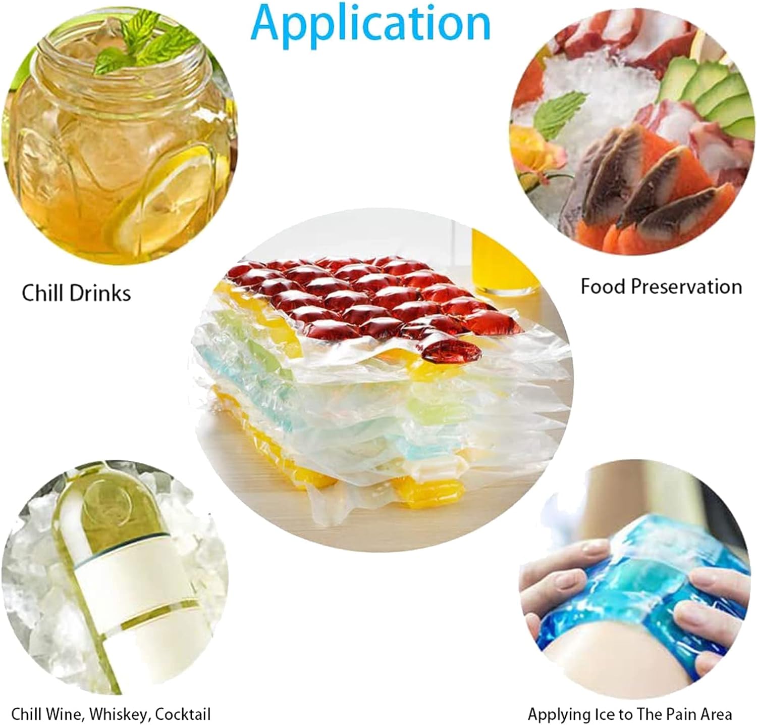 AMPLE ICE CUBES :You don't have to wait for the mold to be emptied. You can make enough ice cubes at one time, a bag can make 24 ice cubes, you can even make hundreds of ice cubes at a time, it is perfect for a summer party.It is suitable for families with small freezer or a lot of food is stored in the refrigerator.