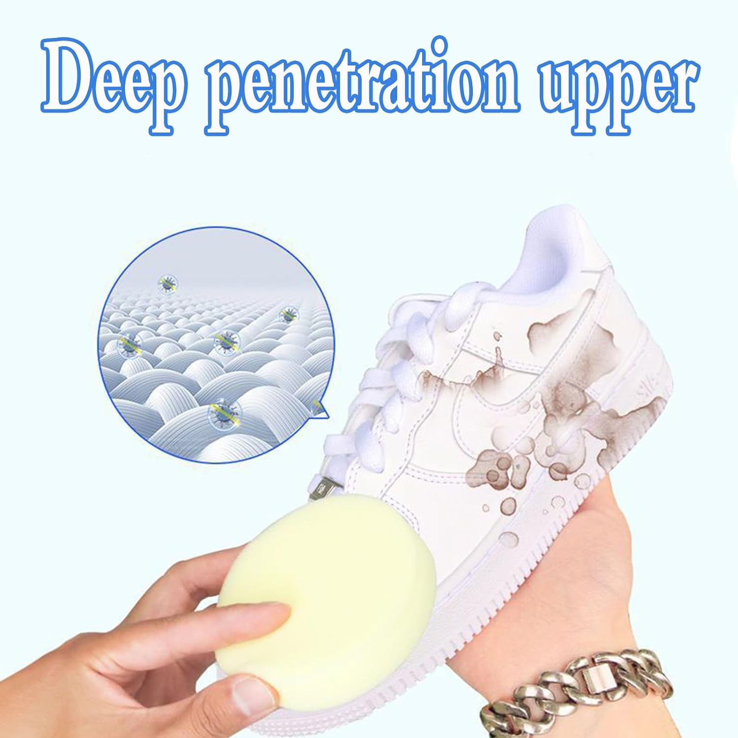 After years of research and development by a team of professionals, a scientific stain removal formula is used to achieve a very efficient cleaning method. The M-BIMR small molecule stain removal technology is used to penetrate deep into the crevices of the shoe and remove stubborn stains.